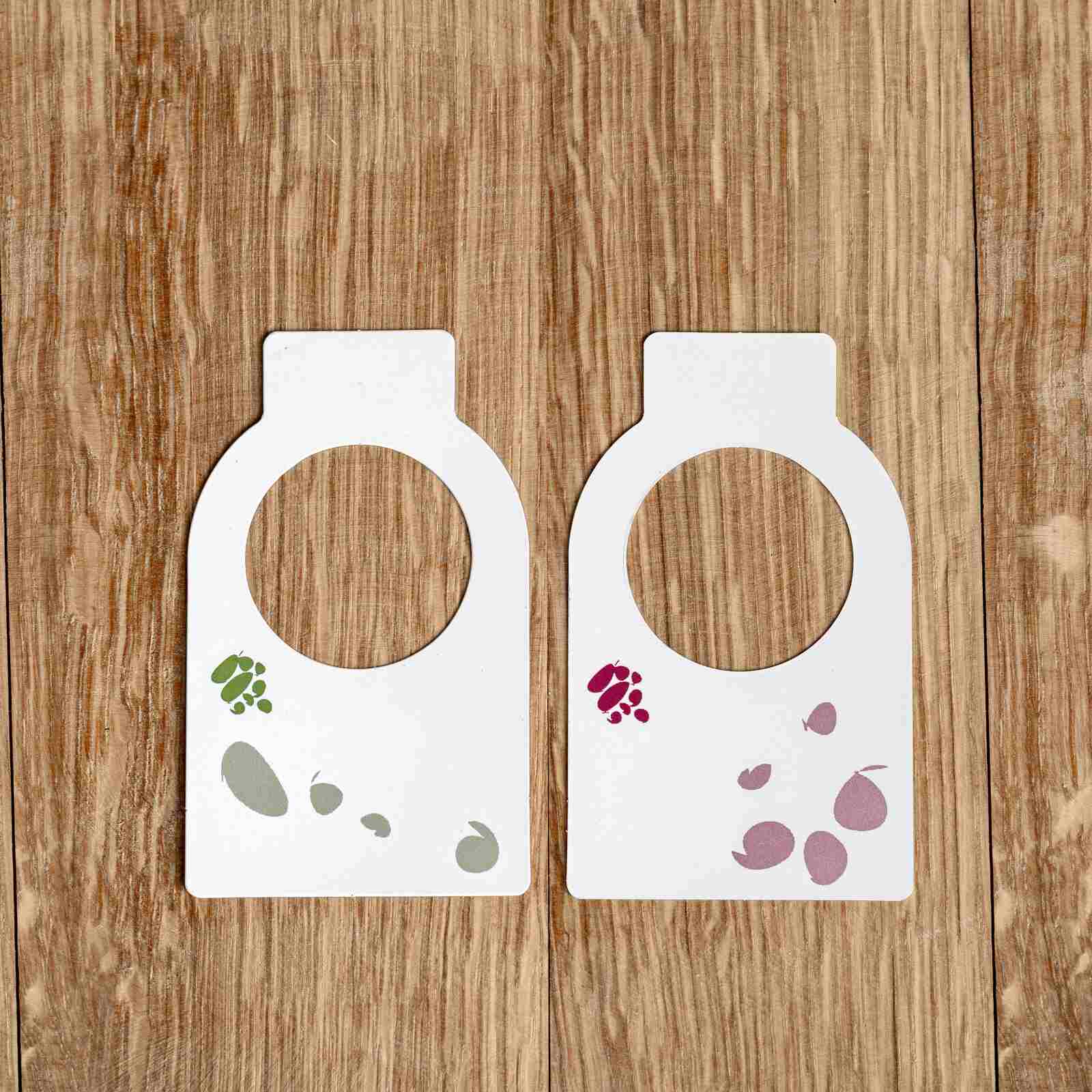 Flaschenanhänger zum Beschriften mit einer Grammatur von 350g. Beidseitig bedruckt für Rotwein und für Weißwein.