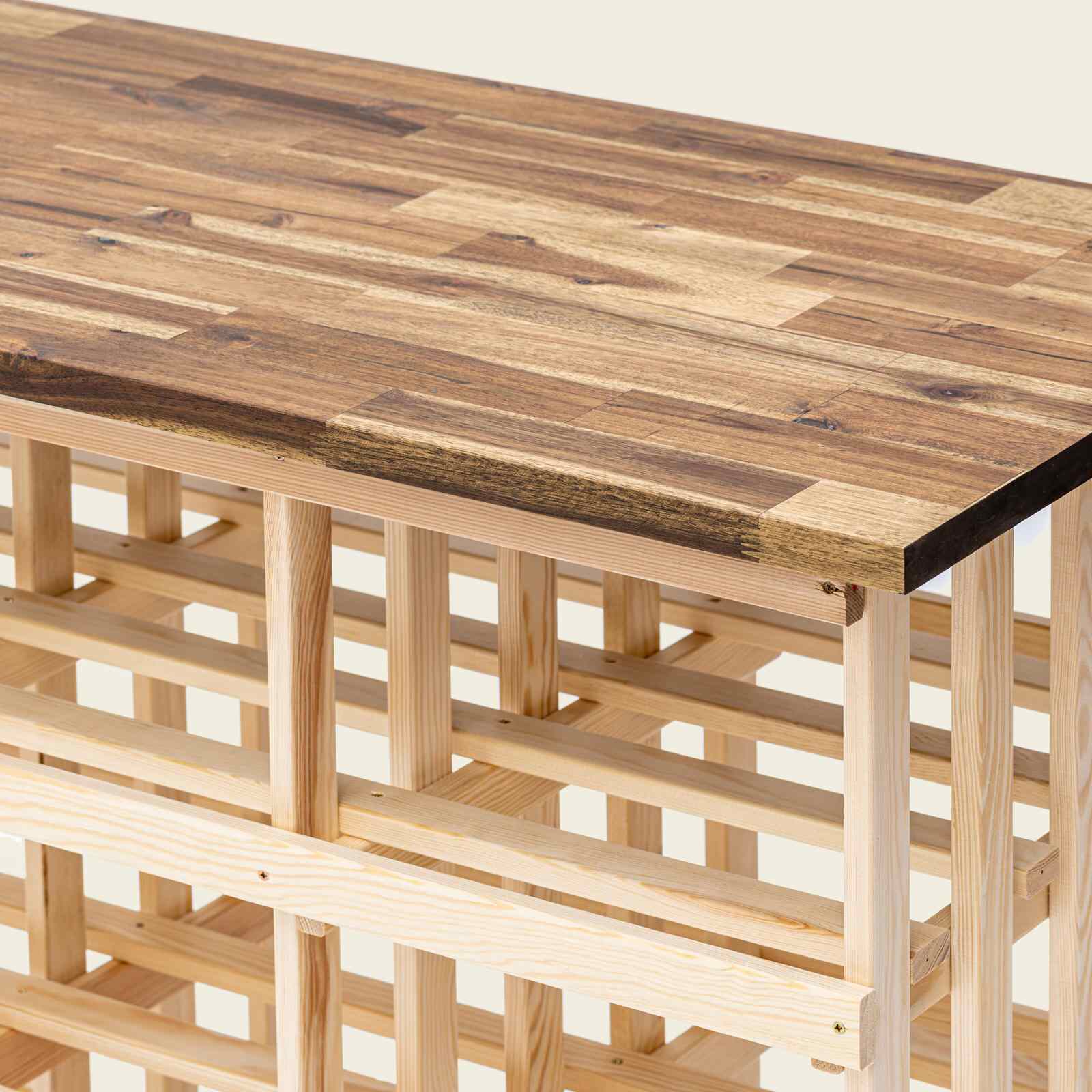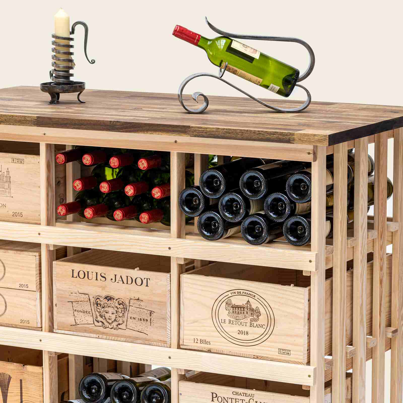 Weinregal für Original Holz-Kisten (OHK), fasst bist zu 144 Flaschen in 12 Kisten. Aufgrund der Höhe und der dekorativen Deckplatte ist es besonders als freistehender Tisch in der Raummitte geeignet.