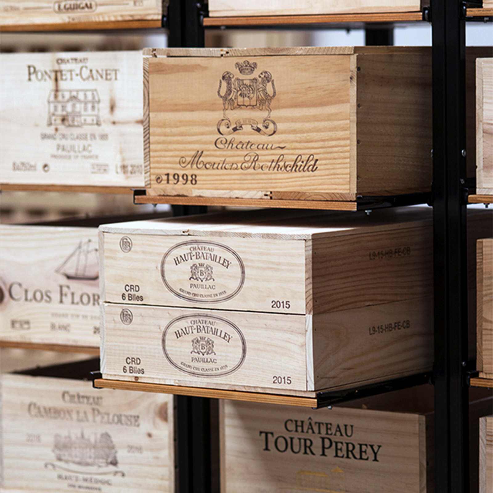 Solide Metallkonstruktion mit Rollauszügen, konzipiert für OHK (Original Holz-Kisten) à 12 Flaschen. Der Kistenturm hat 8 stabile Auszüge aus 10 mm Multiplex. Auf dem Beispielfoto sind drei Kistentürme aneinandergeschraubt. Die abgebildeten Weinkisten sind Dekoration.