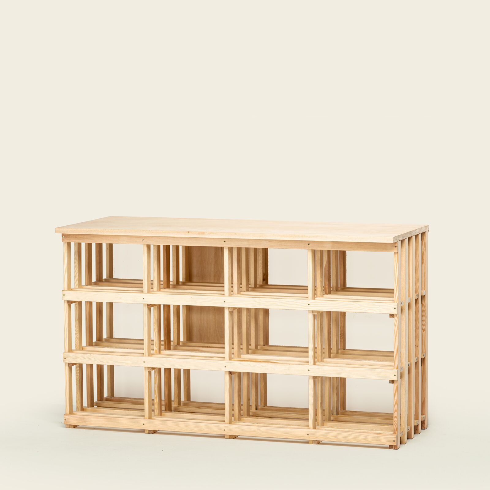 Weinregal für Original Holz-Kisten (OHK), fasst bis zu 144 Flaschen in 12 Kisten. Das MS-Kombi 4 lässt sich mit verschiedenen Aufbau-Regalen zu formschönen und praktischen Ensembles kombinieren.