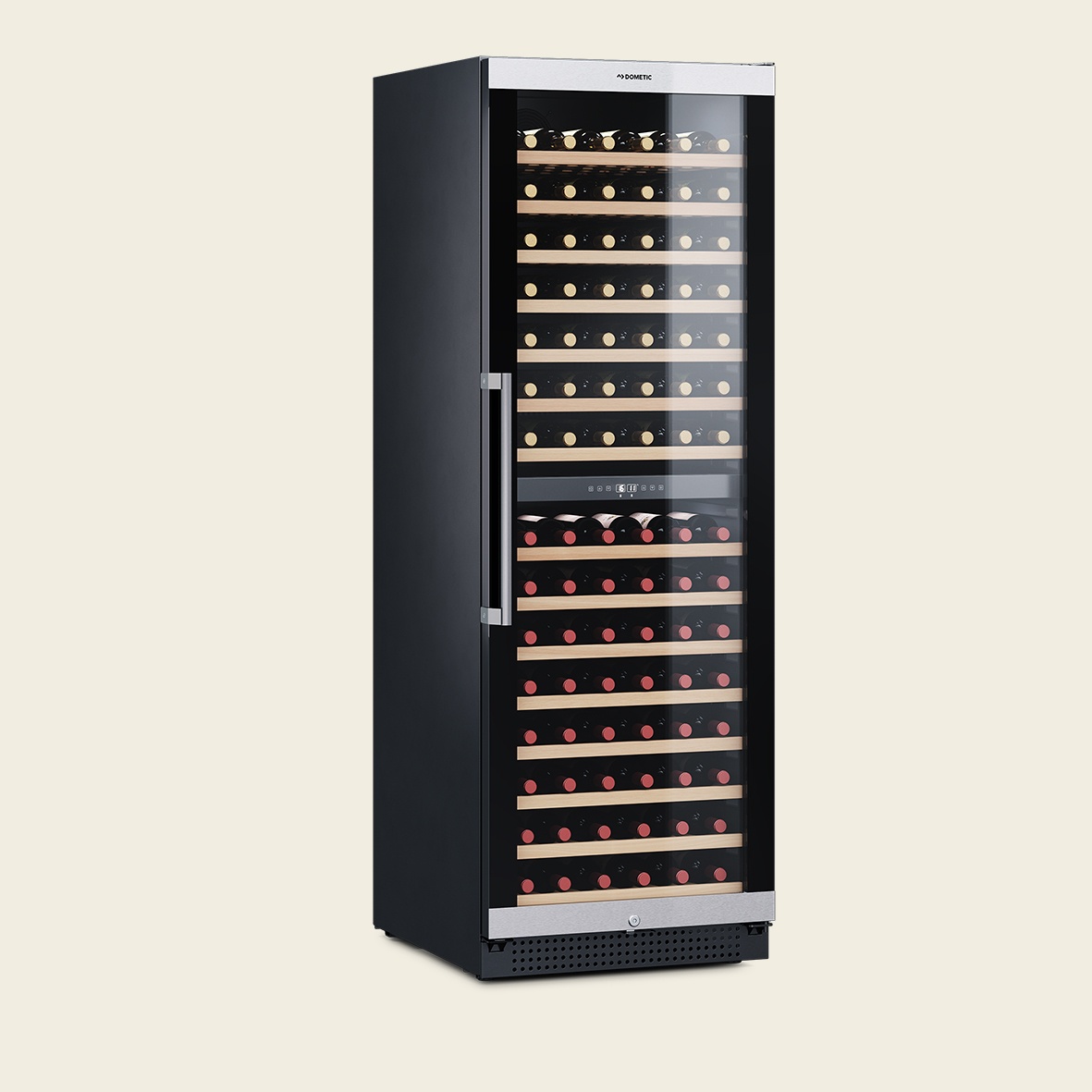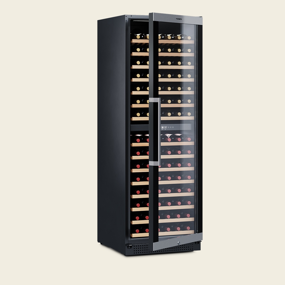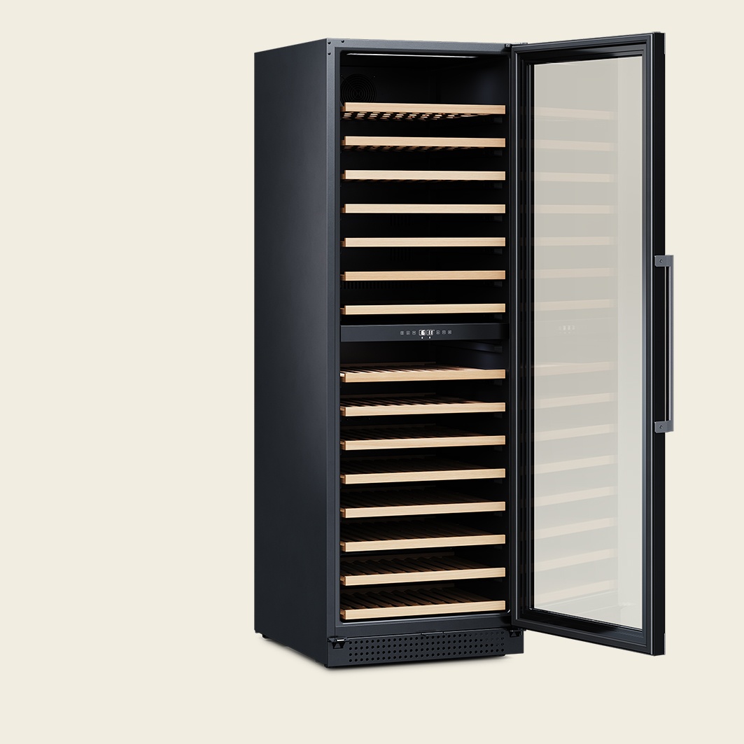 Kompressor-Weinkühlschrank mit zwei Zonen, freistehend oder als Einbau, 154 Flaschen, abschießbar.