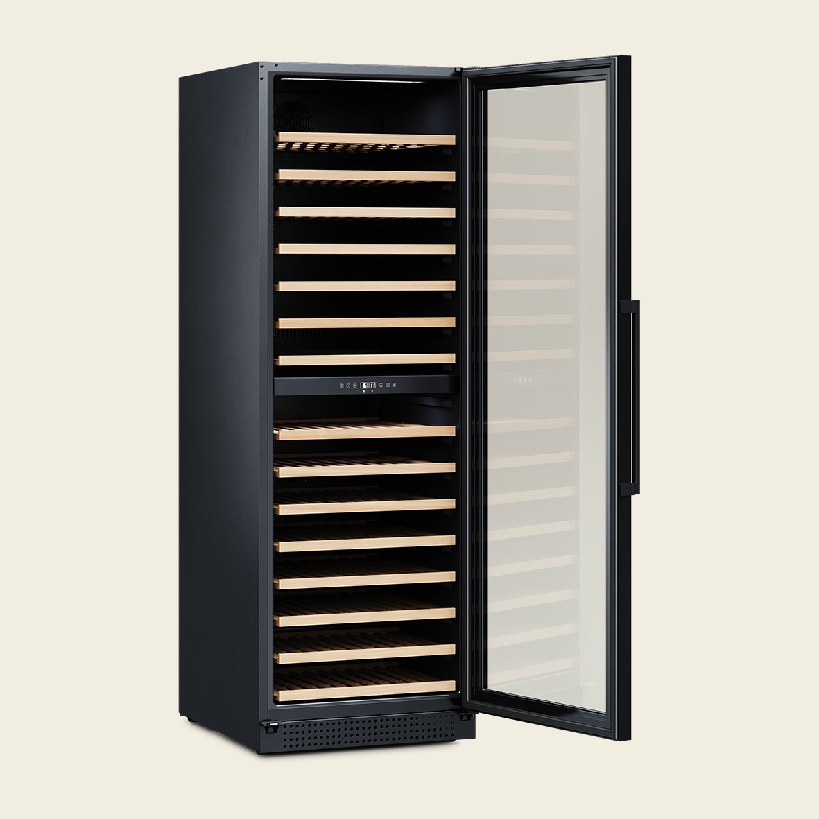 14 elegante Ablagefächer aus Holz auf Gleitschienen bieten Platz für 154 Bordeaux Flaschen. Die abschließbare Tür kann von rechts nach links versetzt werden. Integrierter Kohlefilter und Kondenswasser Schale. Die dreifach verglaste Low-Emission-Glastür schützt den Wein vor Schäden durch ultraviolettes Licht. Minimaler Wartungsaufwand durch automatisches Abtauen und Abtauwasserverdunstung. Optimieren Sie jeden Innenraum mit diesem Zwei-Zonen Weinkühlschrank, der freistehend oder nahtlos als Einbaumöbel integriert werden kann und eine elegante Ergänzung für jedes Zuhause darstellt
