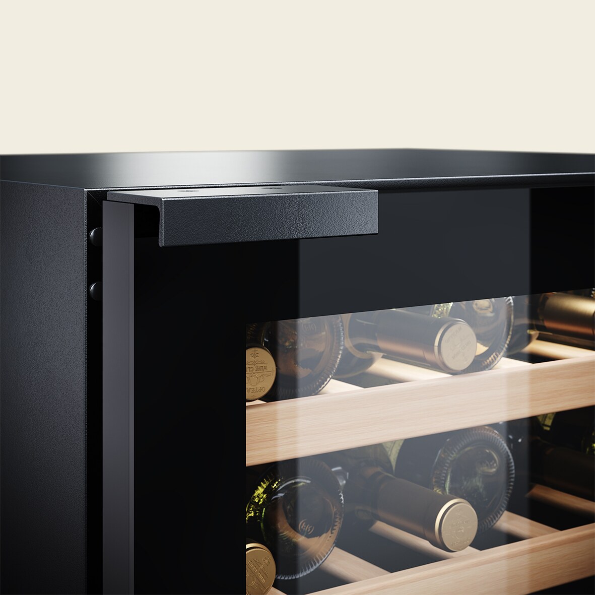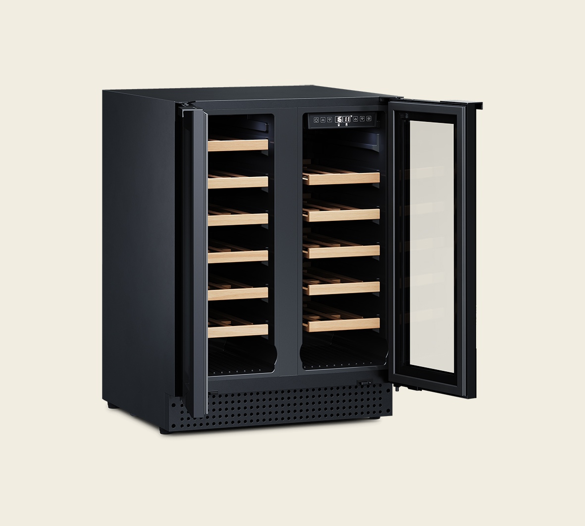 Optimieren Sie Ihre Küche mit diesem Zwei-Zonen Weinkühlschrank, der nahtlos als Einbaumöbel integriert werden kann, und zaubern Sie einen eleganten Stil in jedem Zuhause. Der Weinkühlschrank bietet Platz für 42 Bordeaux Flaschen, die auf eleganten Holzregalen präsentiert werden.