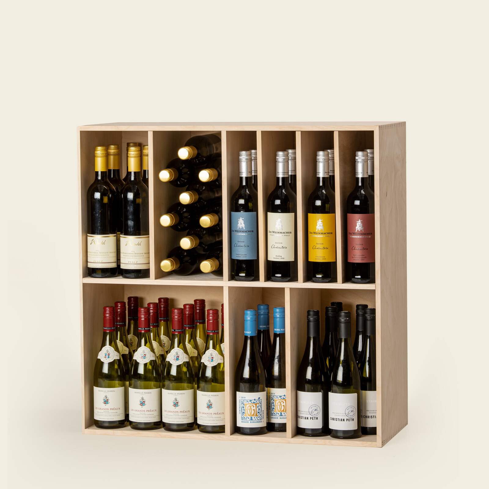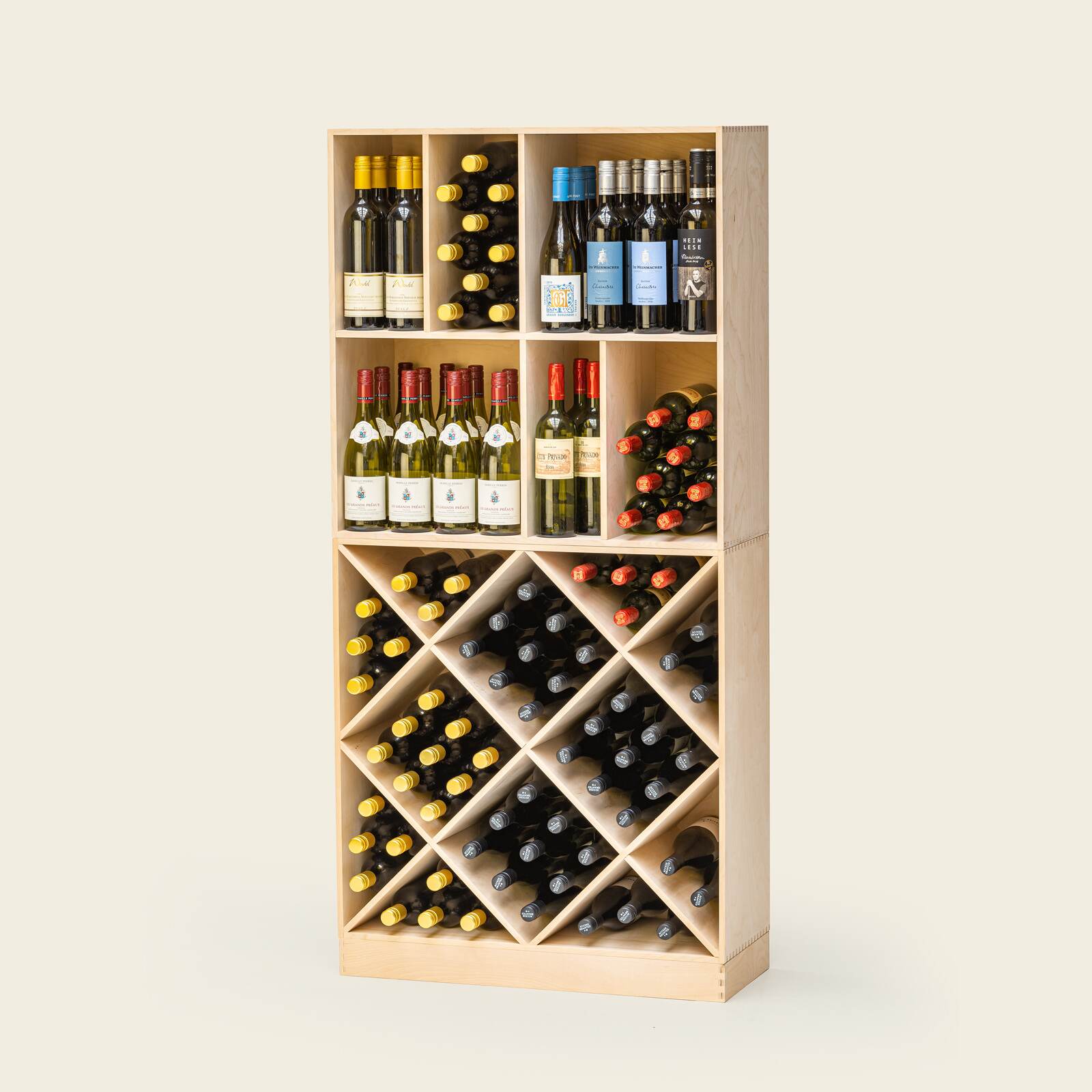 Weinregal aus Holz für bis zu 60 Flaschen, ideal für Burgunder, Bordeaux und Magnum Flaschen.