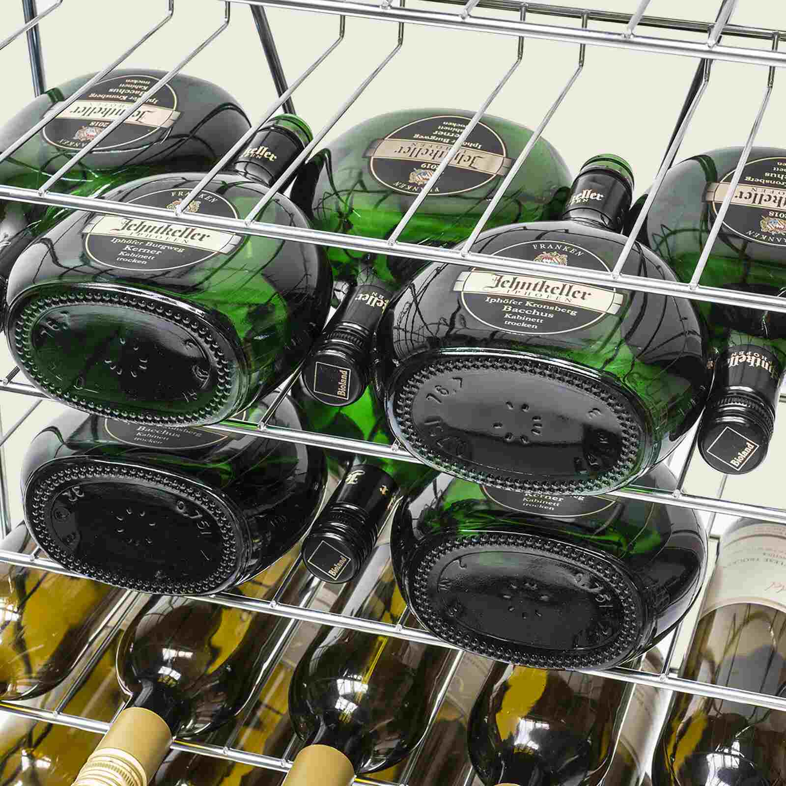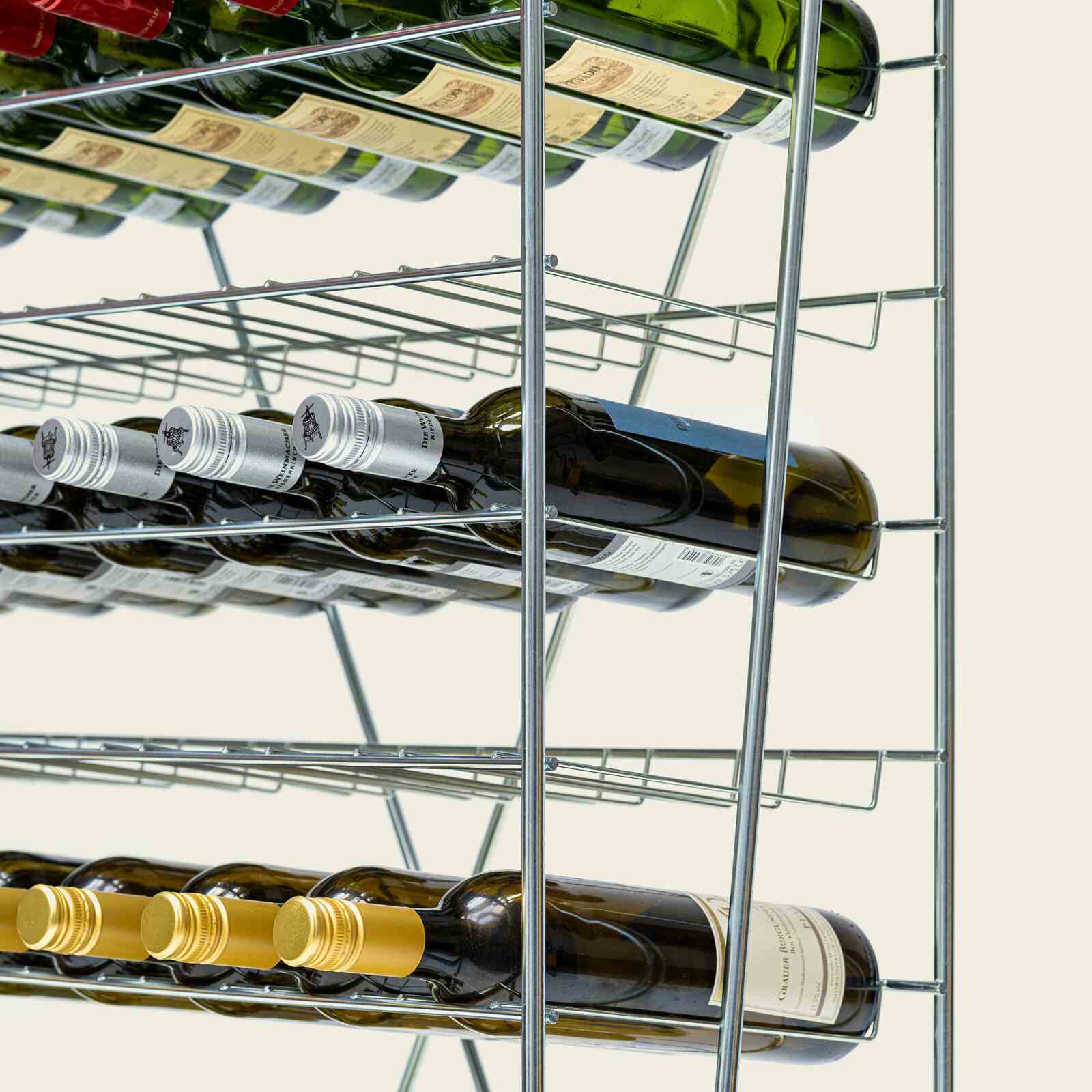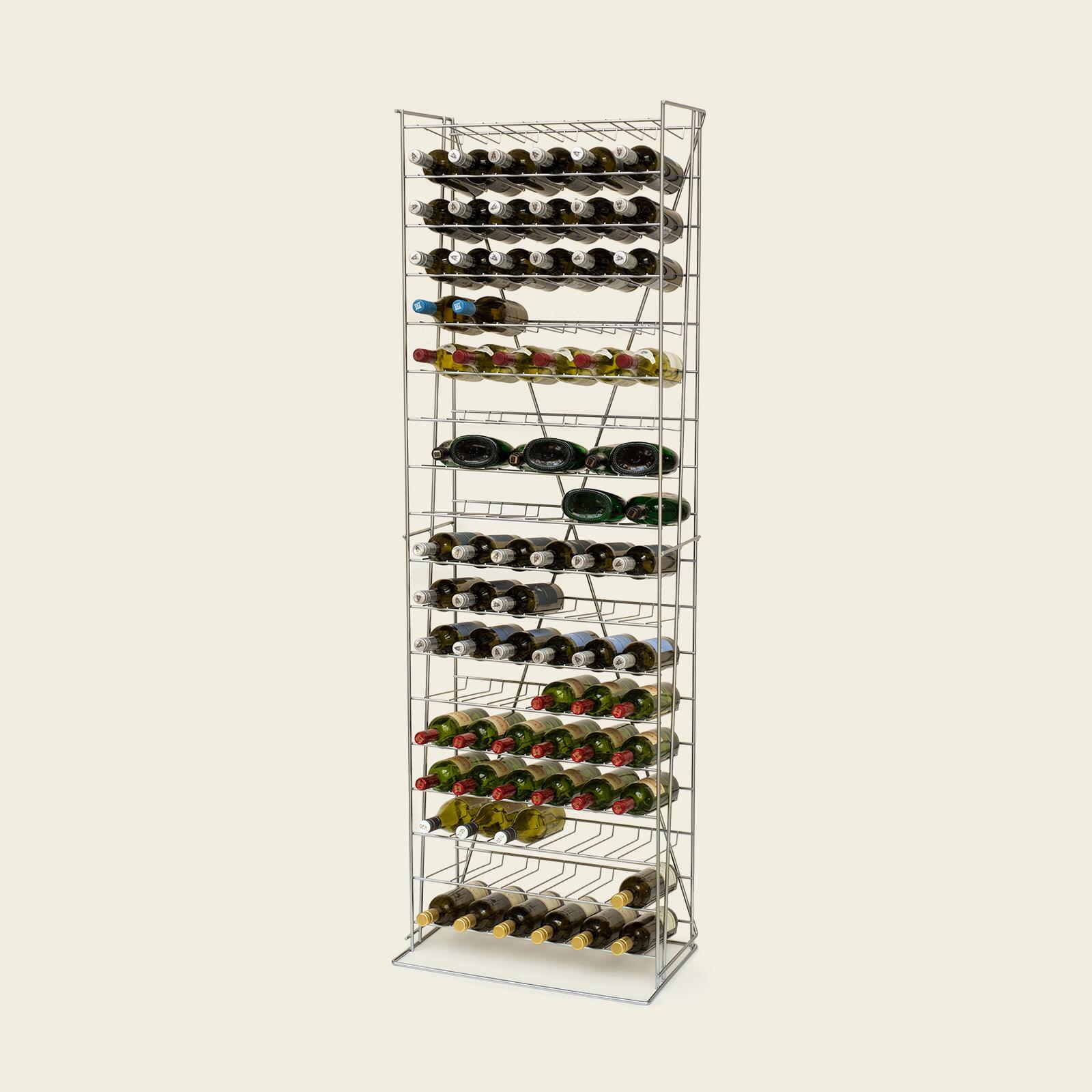 Weinregal aus Metall für bis zu 108 Flaschen à 0,75 bis 1L, geeignet für alle Flaschenformen außer Magnum.