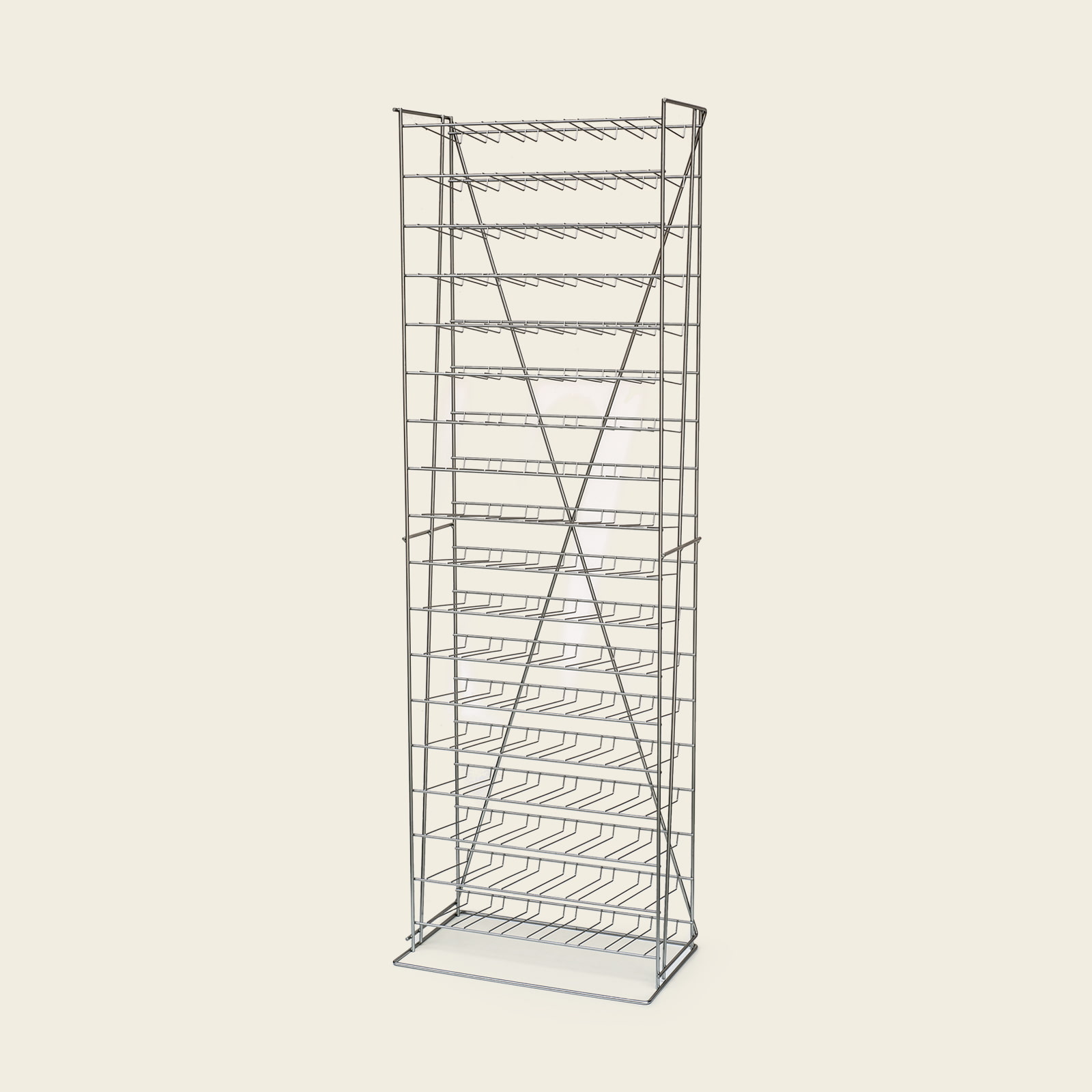 Das Kady 108 ist ein zierlich und transparent wirkendes Weinregal aus Metall für fast alle Flaschenformen, in dem auf 18 Ebenen bis zu sechs Burgunder, Bordeaux, Bocksbeutel, Schlegel-, Champagner, Liter- und halbe Flaschen ihren Platz finden.